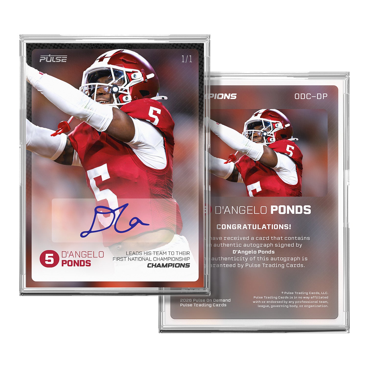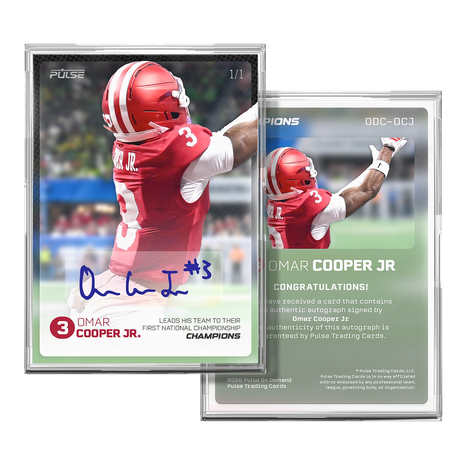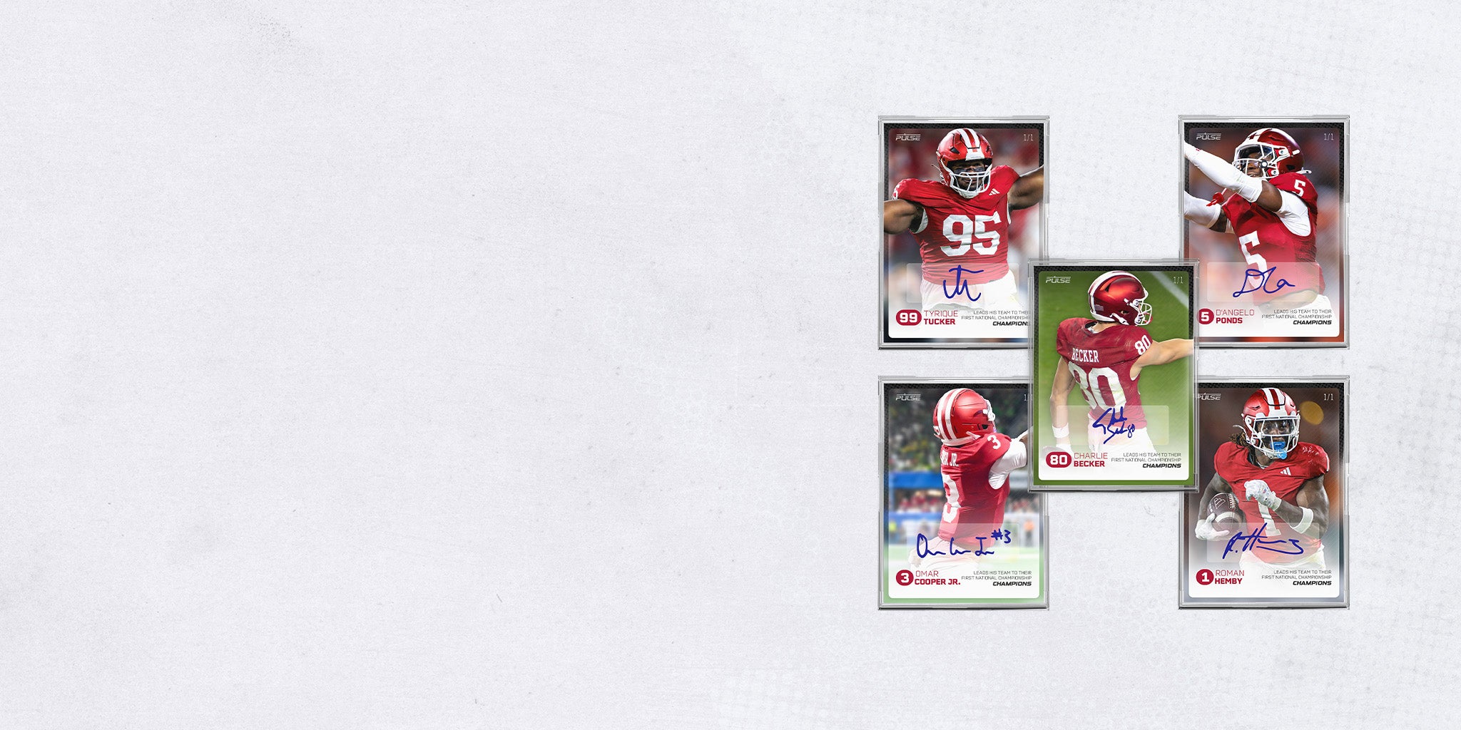 Celebrate a legendary title run with this limited-edition 5-card autographed set from Pulse On Demand, featuring Omar Cooper Jr, Charlie Becker, Roman Hemby, Tyrique Tucker and D'Angelo Ponds — all stars of the 2026 College Football championship team.